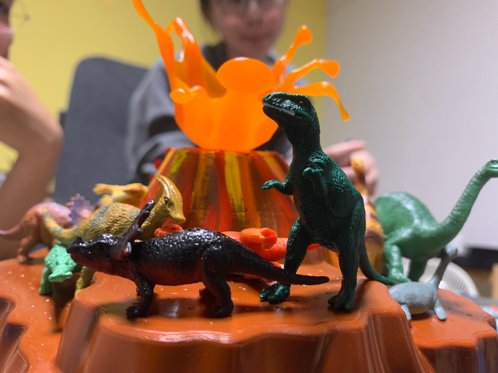 每次要放恐龍,全部人都會圍著火山, 不敢大動作、大聲講話,來個風吹草動或是手抖症發作,恐龍恐怕就倒一片,整個遊戲氣氛超緊張。如果恐龍真的不小心掉下火山,大家就會哄堂大笑,然後再趕緊檢討應該要放哪裡才不會倒,蠻搞笑的。