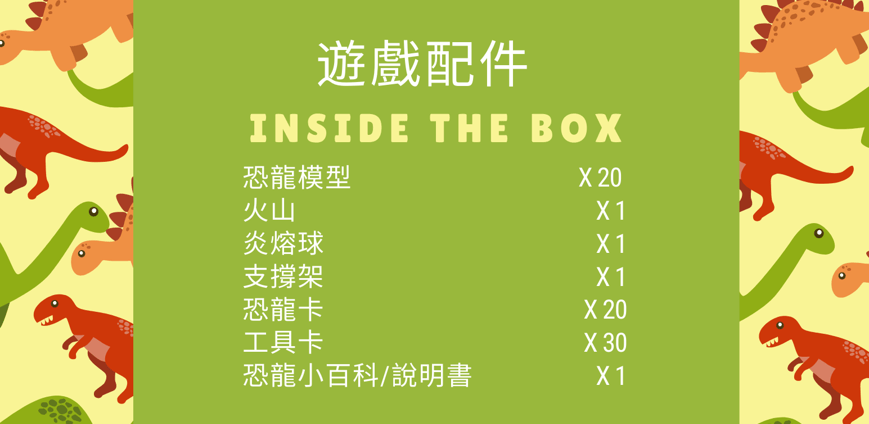 這套桌遊主要概念就是以支撐架支撐火山與熔岩球,而玩家依據牌卡找到對應的恐龍一一擺上火山。但因為每隻恐龍大小及重量不一,為了要能夠維持火山體的平衡,避免讓恐龍們掉下火山,其實相當考驗玩家邏輯策略與手眼協調,再搭配遊戲卡牌可以陷害其他玩家陷入「恐龍放不上去火山」或「絕對會掉下來」的窘境啦!
