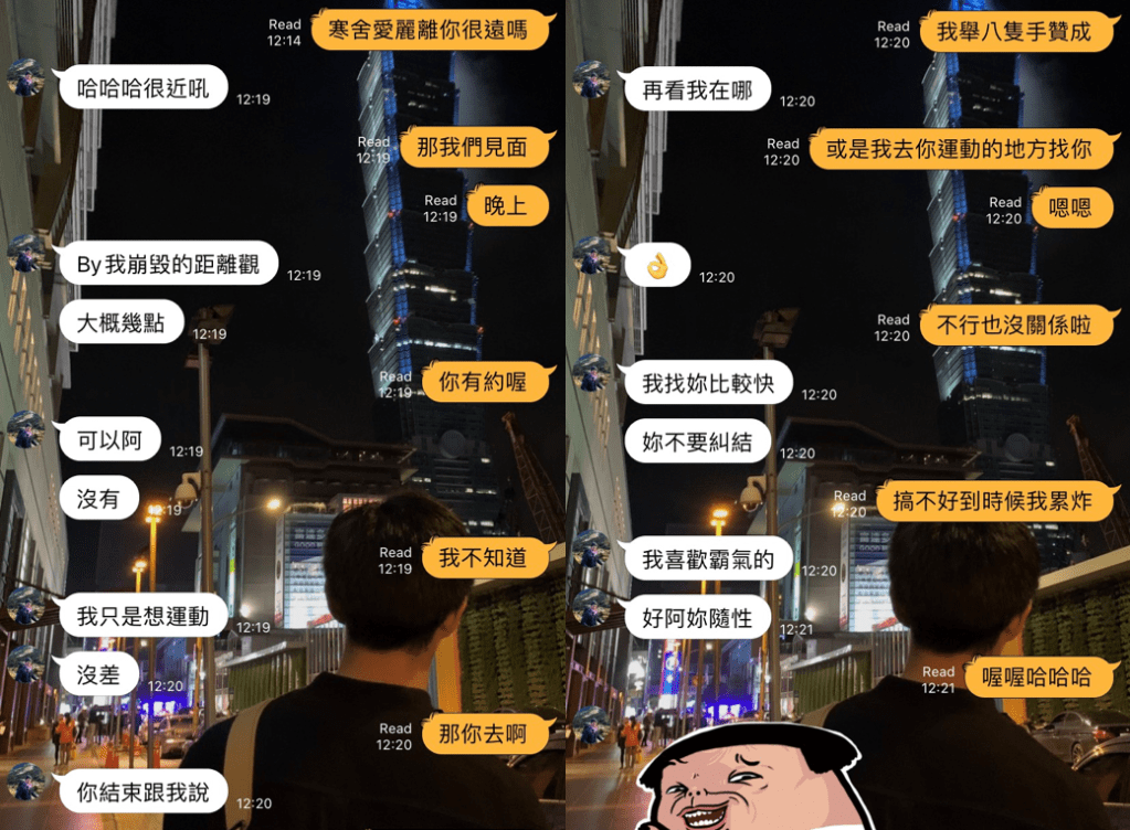 當初亮也有在聊天過程中問過幾次要不要見面,啊我還在內心上演我的風險評估,一直都打哈哈輕鬆帶過,都沒有正面回答他,而他也沒有太多惱羞的反應,就是一如往常的與我聊天當網友;直到某天,我相對熟識他、知道自己晚上出席的晚宴在他家附近,就「主動」且很順口地問: