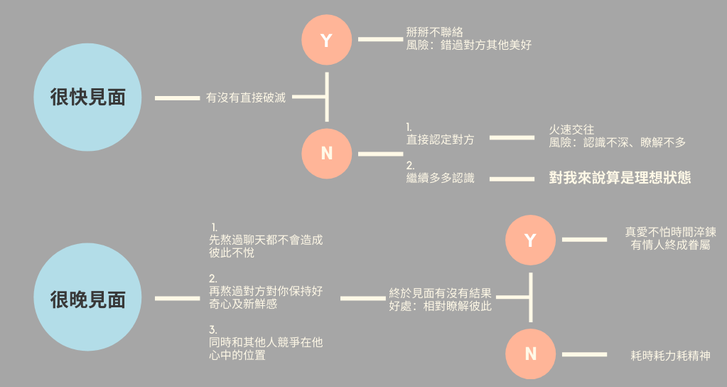 當然,與網友見面是有風險的,越早見面、可能夢越早碎,不只指自己可能失望,對方也可能及早對你感到失望;而越晚見面、對對方能有相對多的瞭解,但也可能因為一拖再拖,錯失良機關係難以更進一步。所以對我而言,「要不要和網友見面」簡直是一場複雜的風險評估。下圖其實只是簡版: