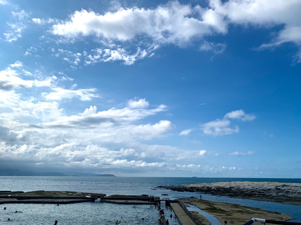 下午四點的海邊其實陽光已經漸漸被雲遮住,現在下水非常完美!藍海泳池水深有250公分,一般成人是踩不到地的,所以強烈建議使用救生衣,會比較有安全感(現場也有可以租借的)。救生員是有跟我說女生不用救生衣,男生有再去英雄救美就可以了哈哈。另外,此泳池每90分鐘會清場一次進行清理,我個人覺得水很乾淨也很安全。