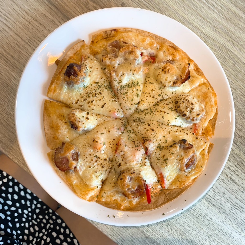 飛魚卵香腸比較重口味,但滿溢出來的起司,多到可以平衡香腸的鹹味,薄餅皮咬上去脆脆的,確實很好吃!不過,害怕洋蔥的人不要點,這道餐點有不容忽視的洋蔥。