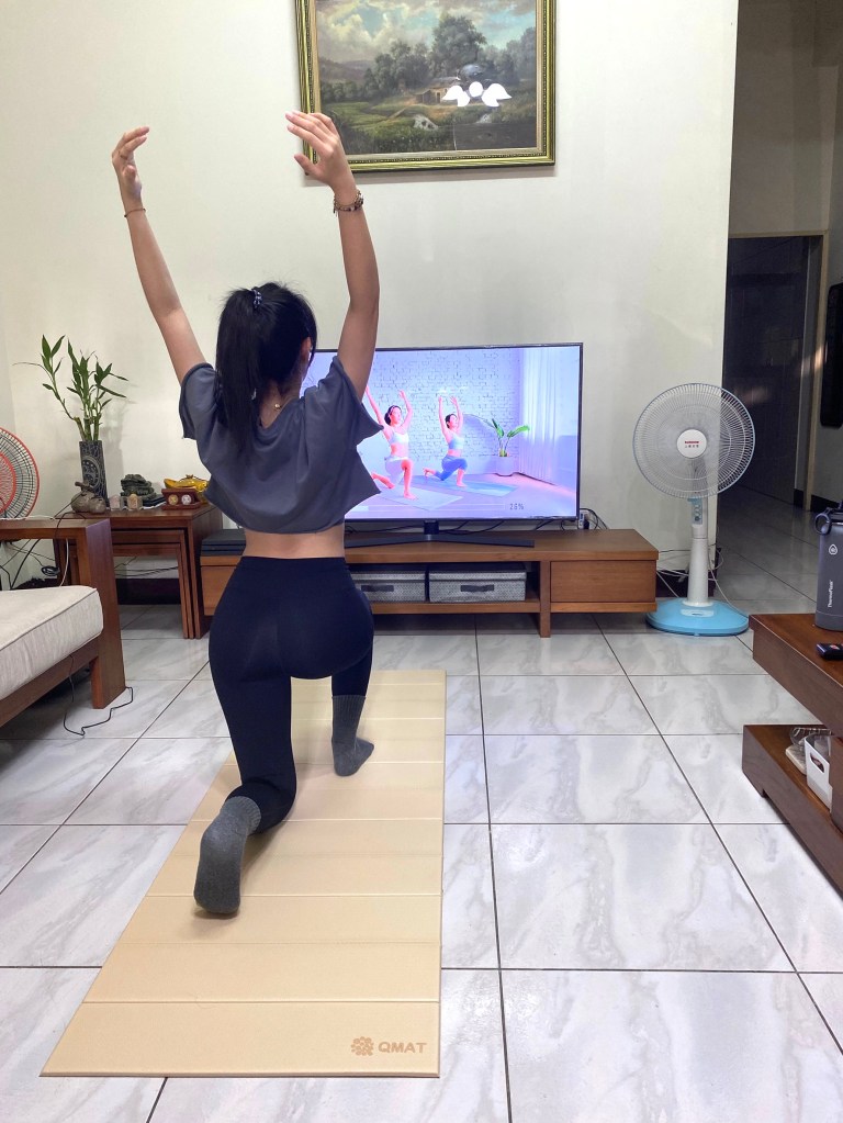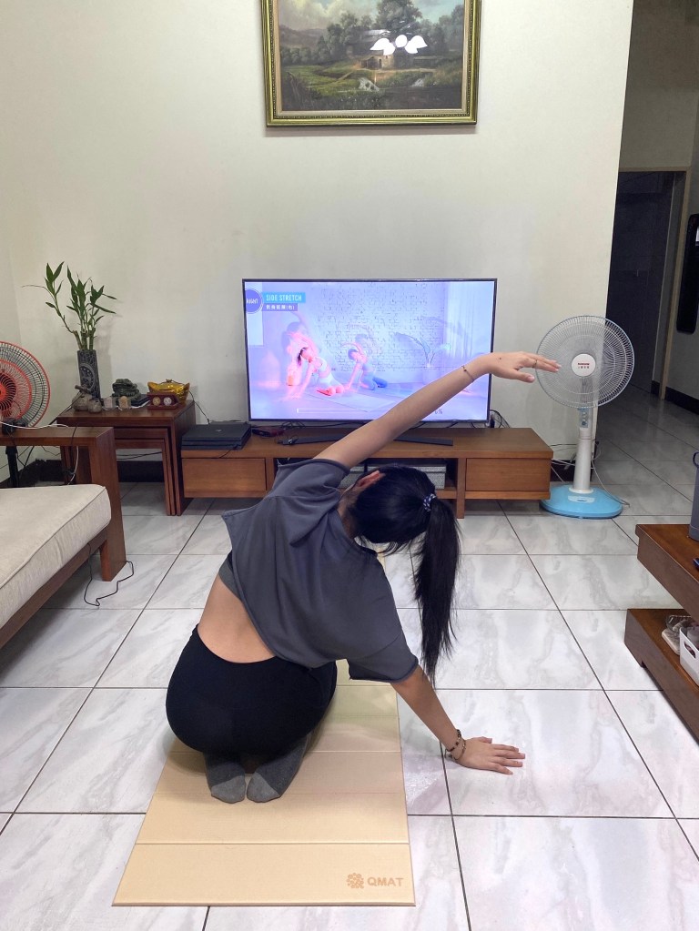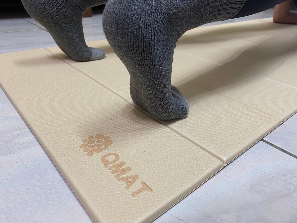 而QMAT瑜珈墊止滑效果真的沒話說,穩穩地待在地板上,不會因為動作而被移動。