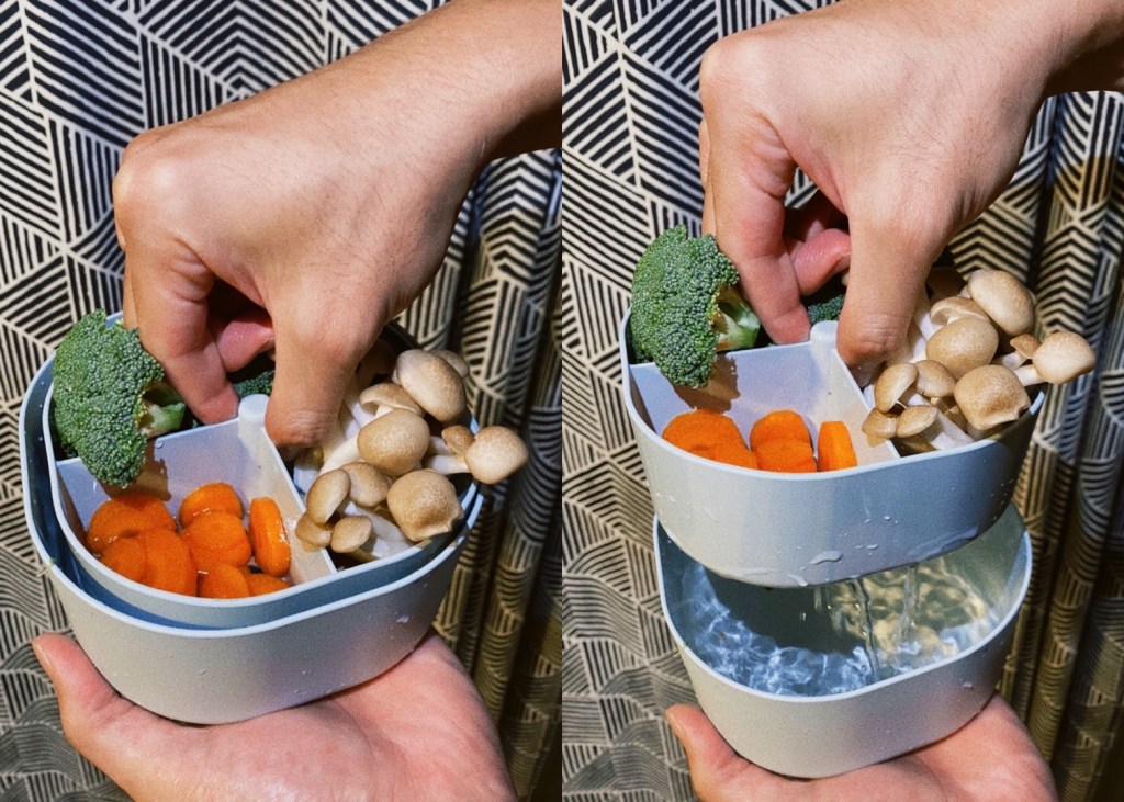 其餘便當的菜色就看個人喜好,而我是一併用「日日便當盒」附的超方便三格瀝水隔板洗菜備料,不同菜放在不同格,也不用怕把水倒掉的時候,菜也倒滿地!