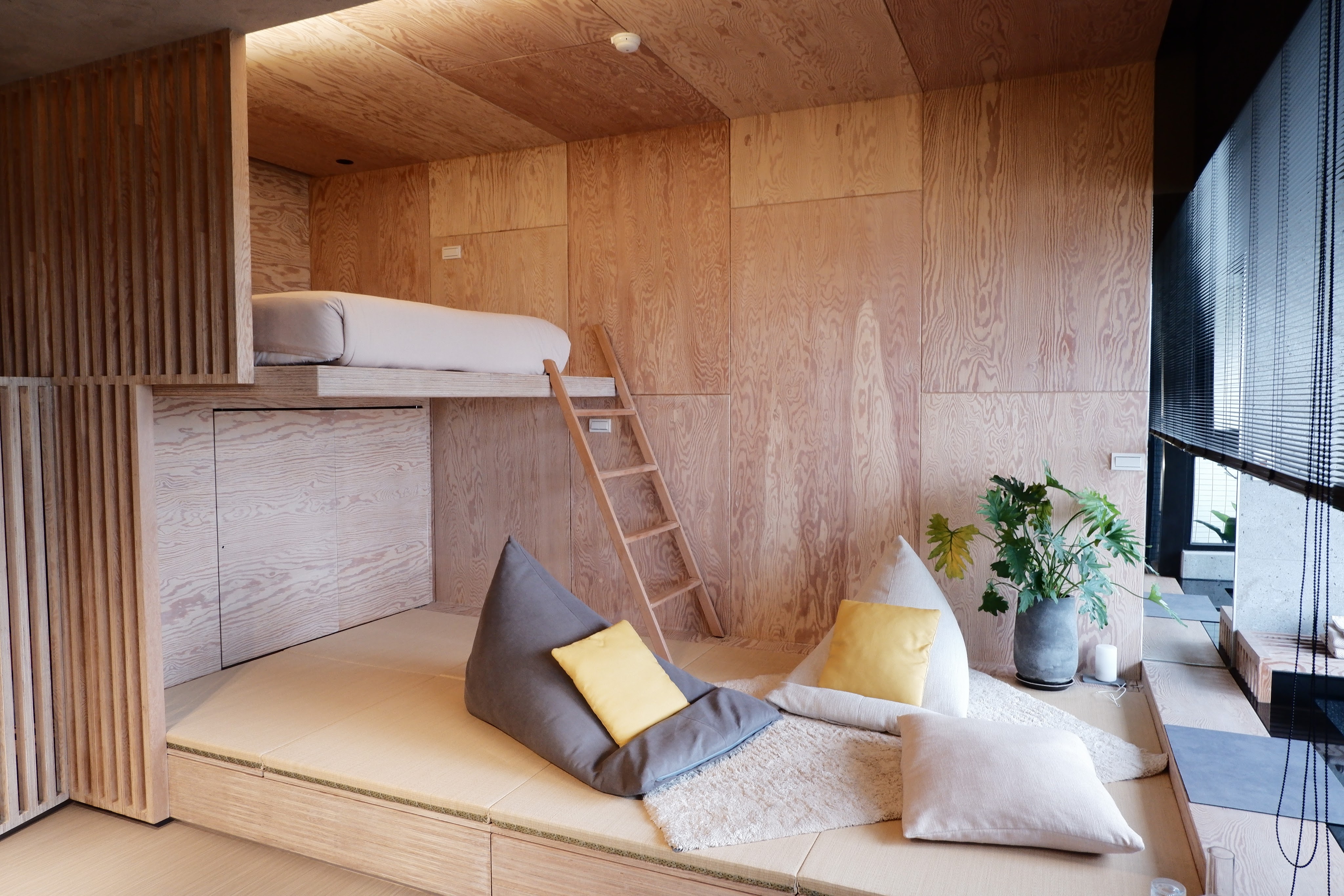 睡覺的地方是一個樓中樓的空間,舒服的色系、簡單的一張雙人床,其餘一切從簡什麼也沒有。(BTW 提供下方加床成四人房!)