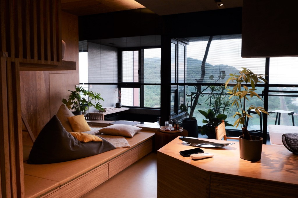 一推開門,窗外自然光透過整面的落地窗映入屋內,整個空間不是太大,但一眼可看見窗外的山海,視線延伸至大自然,給人心曠神怡的感受。