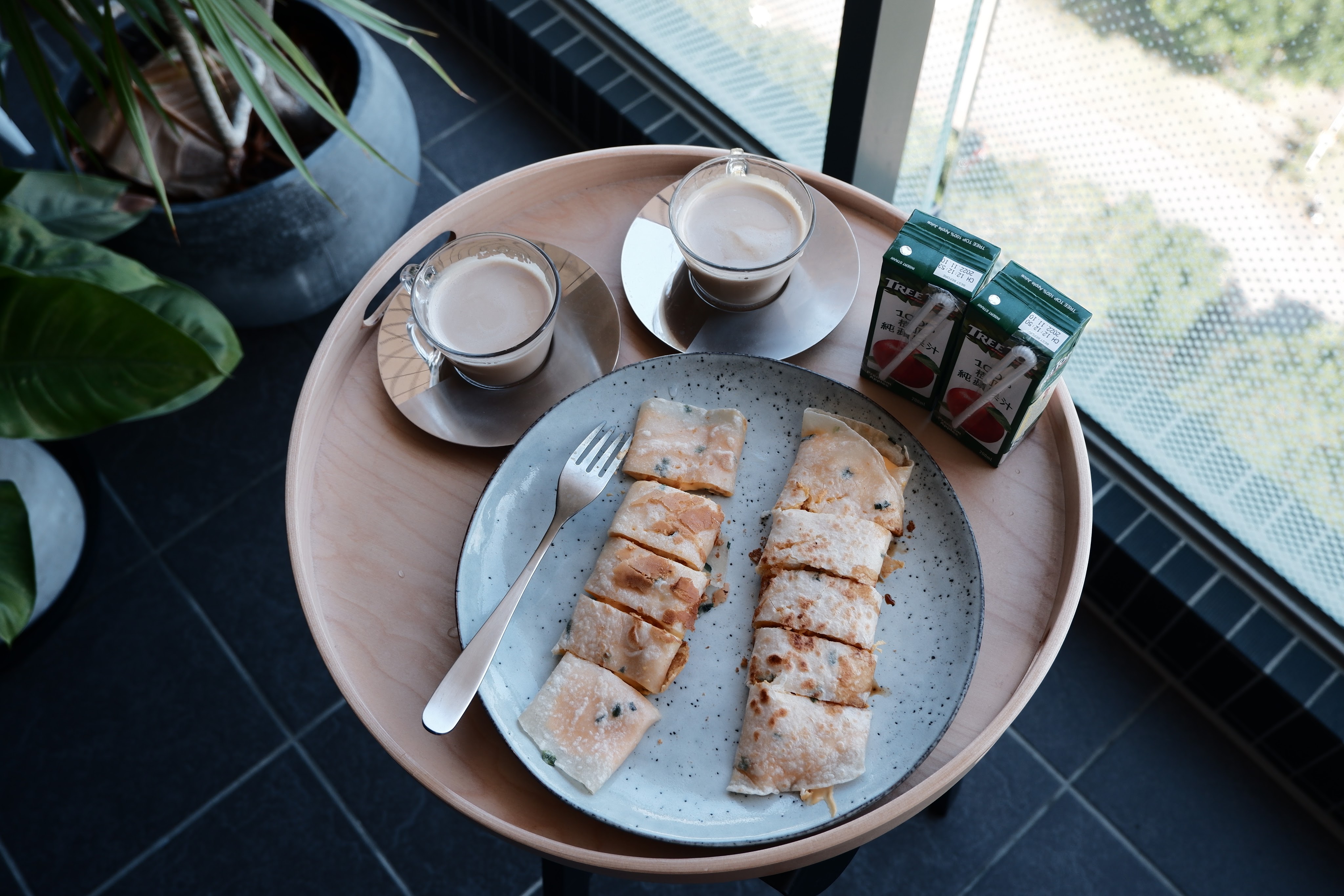 我用準備好的簡單食材煮了兩份愛的起司蛋餅,亮用《易居》提供的Nespresso膠囊咖啡機煮了兩杯咖啡,放上怎樣擺都美的托盤,兩個人穿著睡衣來到陽台,也沒說什麼話,就是看著眼前的好風景發呆,幸福感滿點。