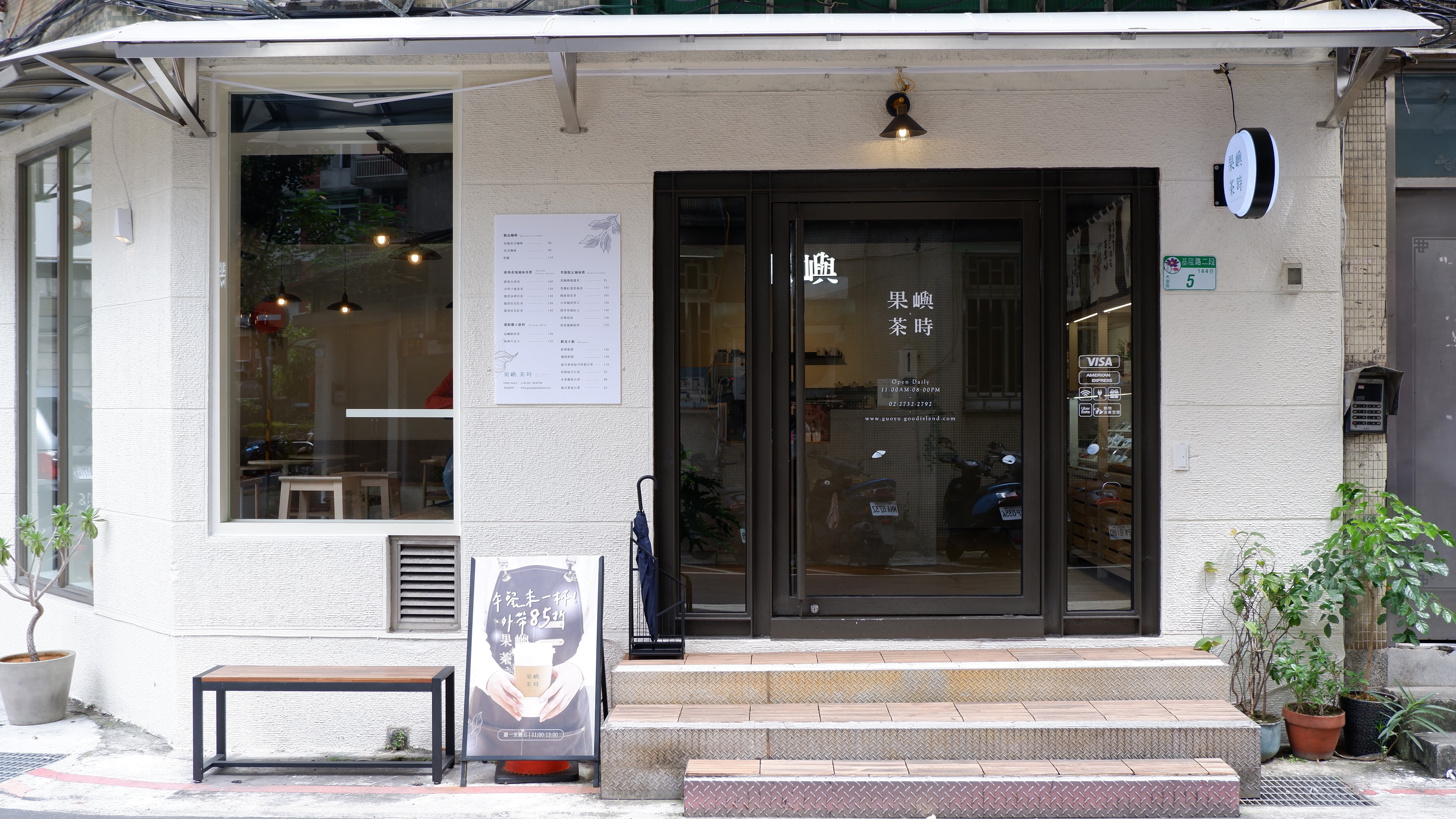 《果嶼茶時》坐落在熱鬧的通化夜市附近,整間店在鬧中取靜的巷弄裡,簡單的白色外牆、好幾面大窗的角間咖啡廳,給人溫暖且樸實的安定感;沒想到的是,走進屋內整個環境更是帶來舒服的寧靜。