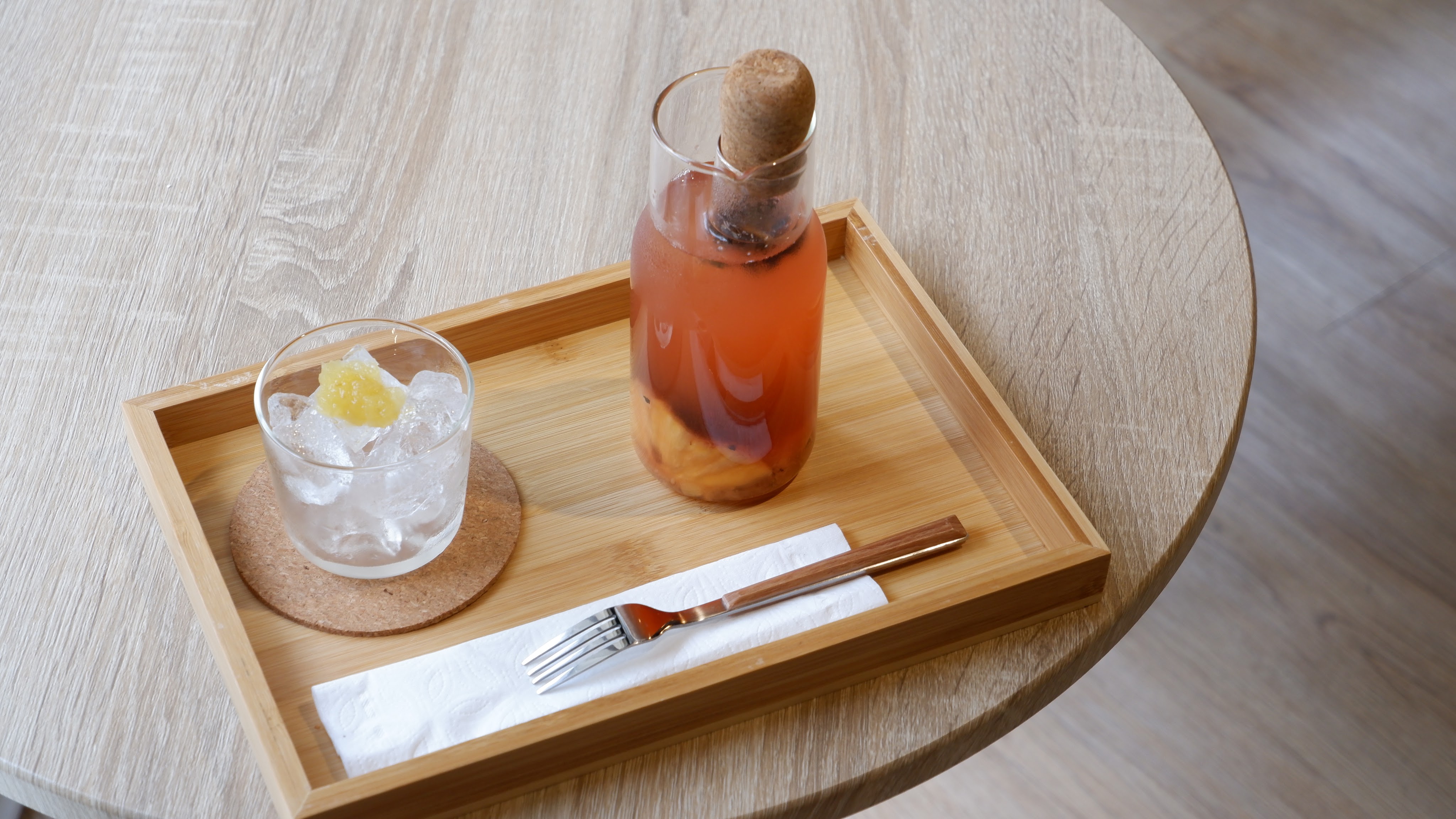 飲品很有夏日感,外觀呈漸層,底部有豐富的天然果乾沉澱,會隨杯附攪拌棒,均勻攪拌後將上頭的橙片對折丟進杯哩,即可飲用;果茶十分清爽、微微甜,可以喝到各種水果的香氣與口味,層次很豐富,一口接著一口喝,一眨眼就被我喝了一大半去了。
