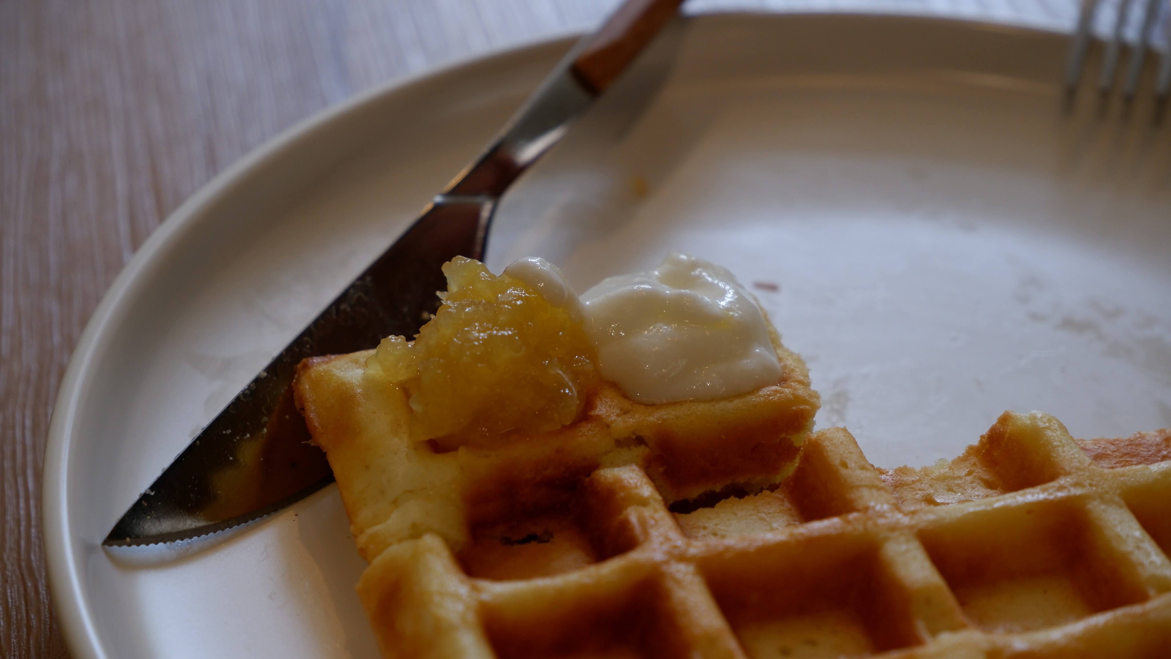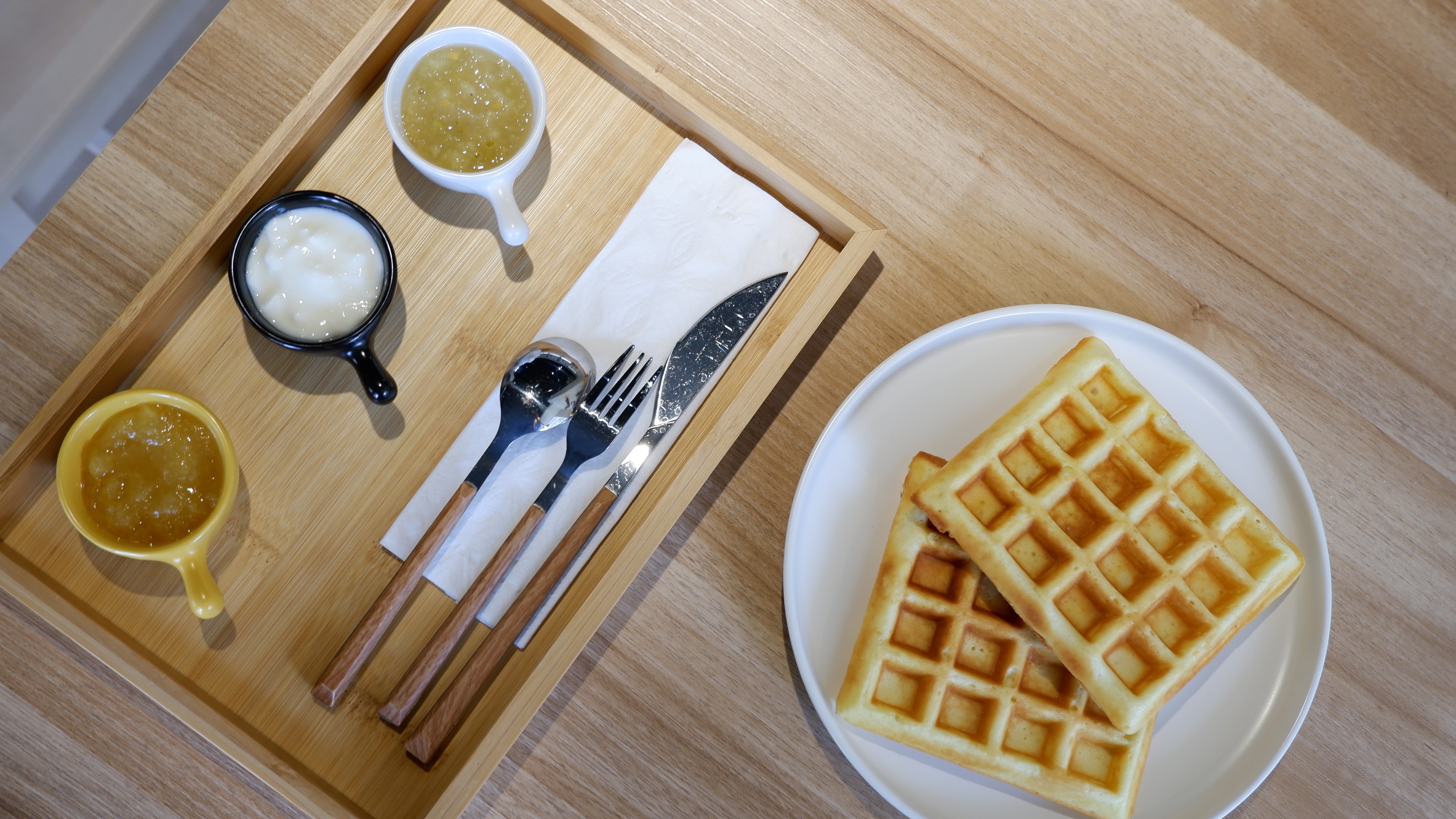 一格一格的鬆餅剛好可以放進不同口味的果醬,每一份都有無糖優格,另外還有芭樂果醬、蘋果果醬及鳳梨果醬,提供客人三選二,點一份就可以吃到三種口味,我個人是覺得很滿足!