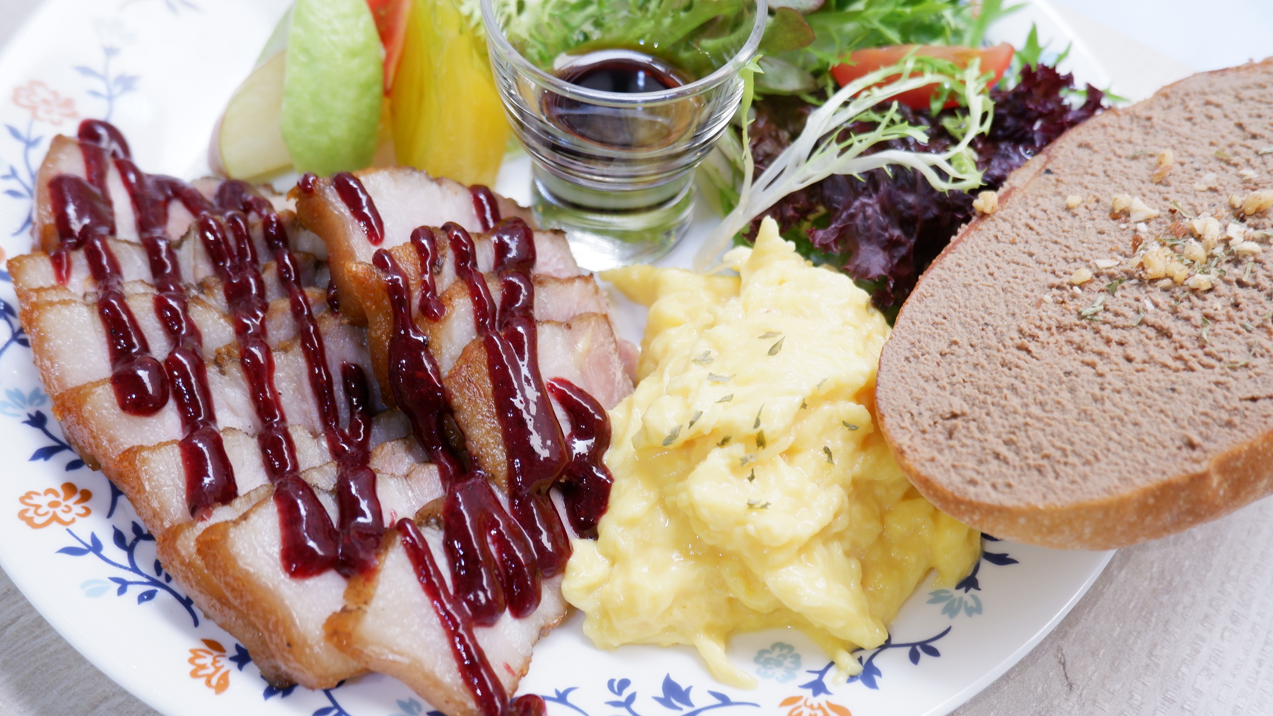 我爸吃了一口,雙眼瞪大地看著我說:「讚喔!」,為了避免我爸用迅雷不及掩耳的速度消滅他,我趕緊夾了兩片鹹豬肉嚐嚐,非常爽口~老闆精心熬煮的莓果醬是用新鮮莓果製成,淋在重口味的鹹豬肉上,最後的酸甜味會沖淡鹹味,鹹豬肉煎得很Q彈、表皮脆脆的,整道料理吃起來完全不違和,還莫名地和諧。