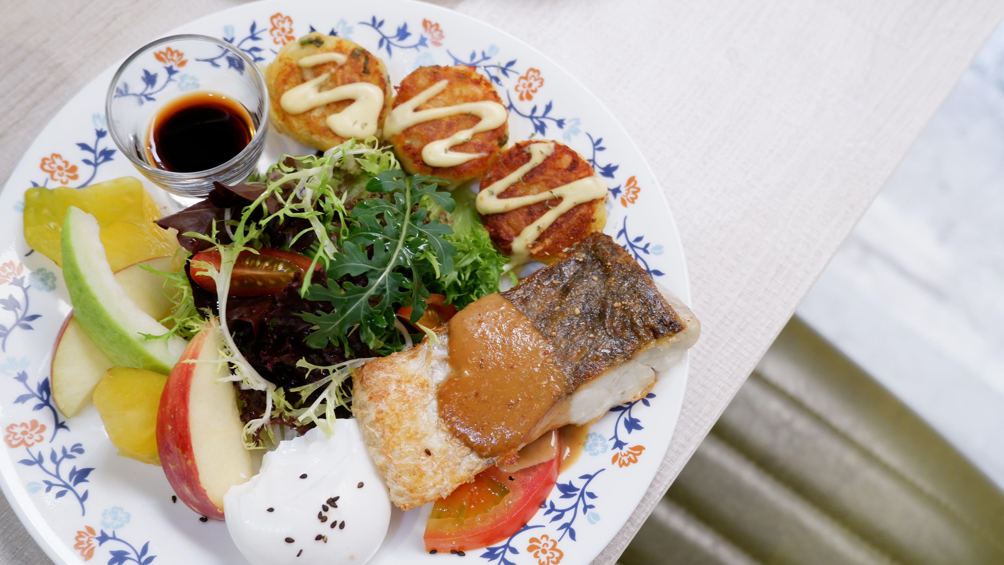 現在回想,真的每道菜都有驚喜。先說這道餐點有厲害的配餐就是那三塊「馬鈴薯南瓜煎餅」,取代普通的薯餅,把馬鈴薯跟南瓜打成泥做成餅煎至微焦,又健康又好吃。