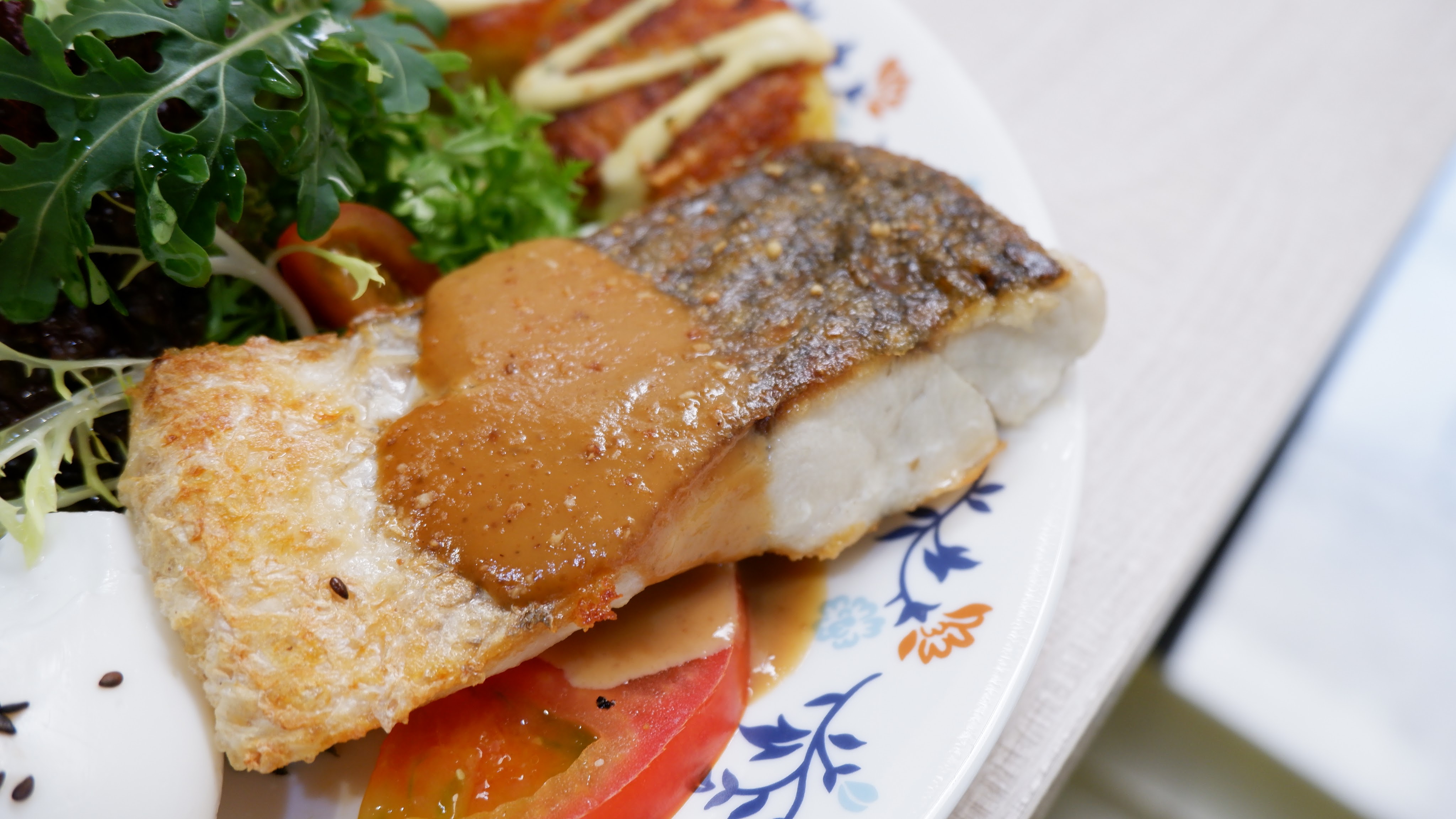 再來是煎得美味的主餐鱸魚,淋在上頭的熟悉醬汁讓我一直在回想這到底是什麼味道!後來得知是老闆特別用「豆腐乳」調製而成的獨門醬汁,真的讚。吼這間店的菜色真的就是很多細節,要慢慢品嚐、仔細感受。