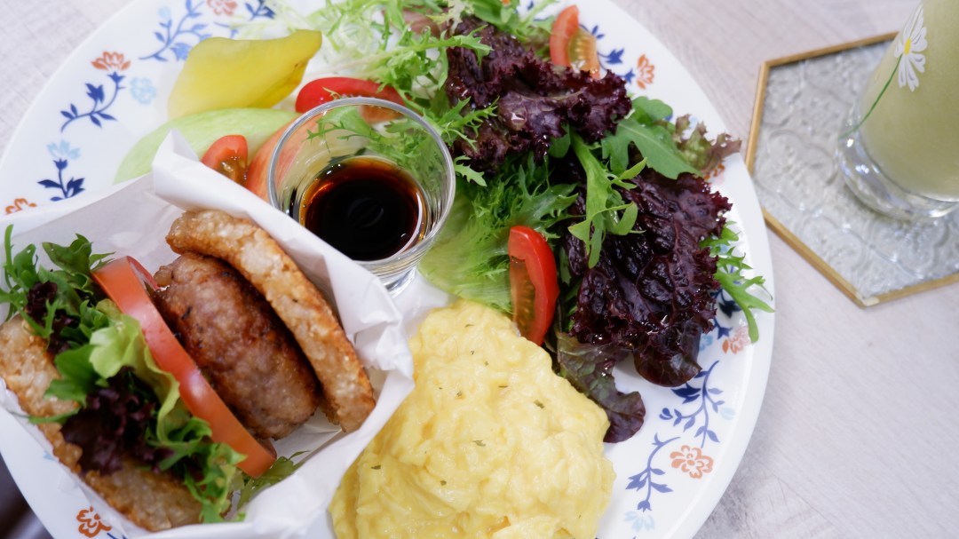 這真的不是印象中的滷肉飯該有的樣子,簡言之是「滷肉排米漢堡」。點這道料理的我弟本人大力讚許,其實這道料理最厲害的是顛覆滷肉飯油膩的印象,將滷肉煎成排加上生菜番茄,再用鍋巴米堡夾起來,吃得到滷肉以及白飯的味道,卻相對清爽、加倍美味;整份套餐還附有法式滑蛋以及水耕生菜,可說是一道中西合璧獨有的特色料理,點啦點起來!