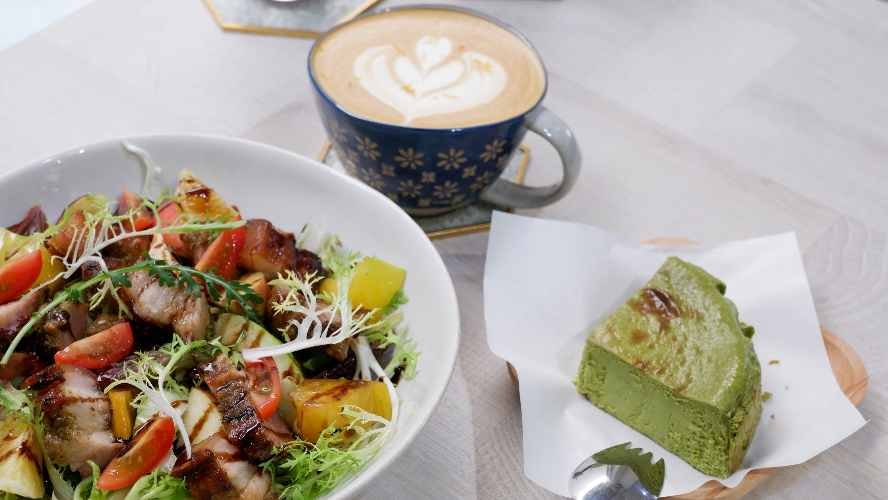 一大盤沙拉、一塊抹茶巴斯克蛋糕,再來一杯微醺拿鐵,簡直就是輕享受套餐;吃完清爽可口的沙拉,飯後甜點是濃郁的抹茶巴斯克蛋糕,相比其他店為了在乳酪蛋糕上形成咖啡色的表皮,放滿滿的焦糖去烤,《述憶灶咖》則盡可能減糖,但蛋糕還是超級無敵爆好吃!