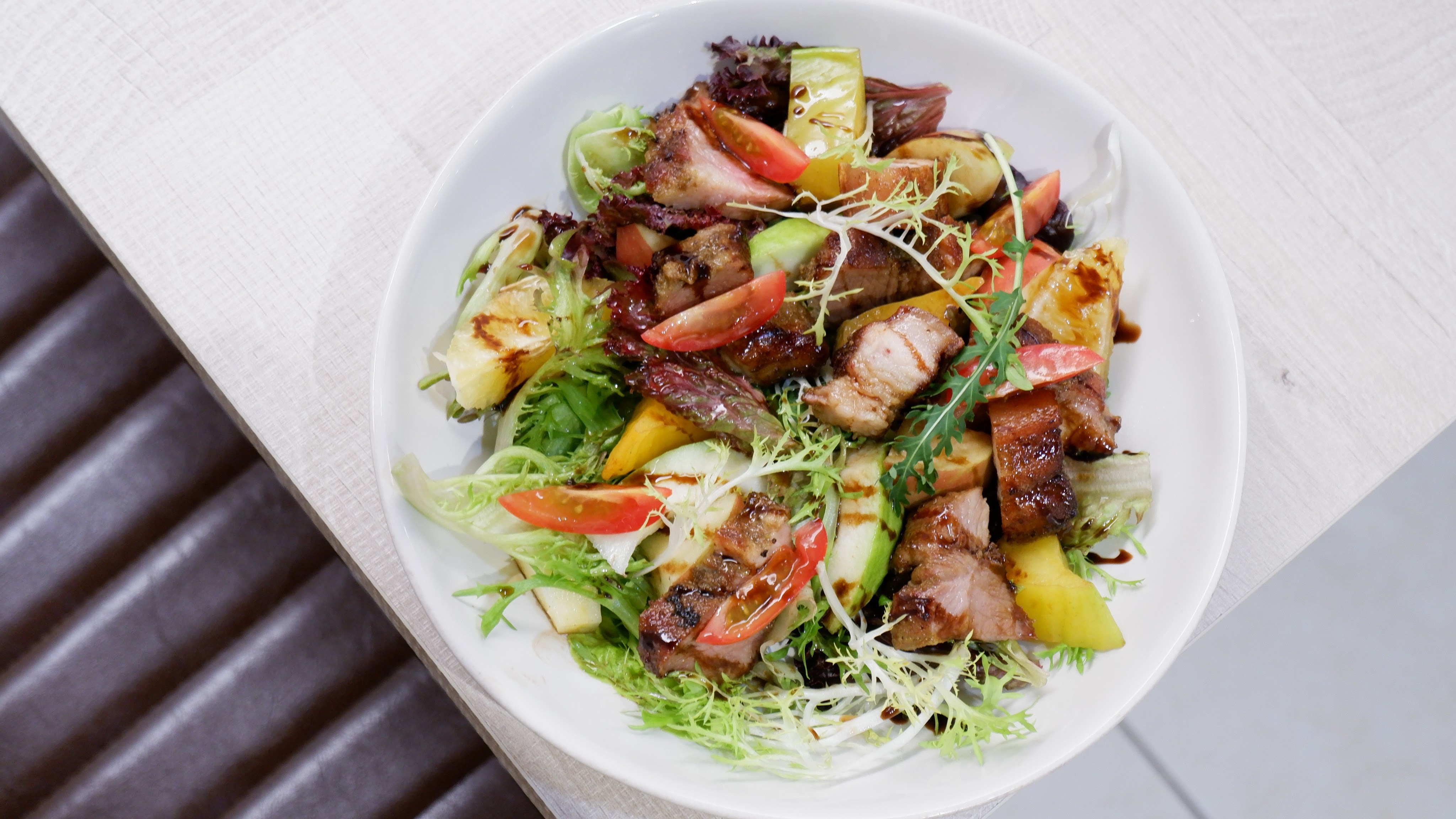 沙拉份量很足,那個豬肉肥的部分不會很多,吃起來嫩又紮實;一整盤滿滿的生菜跟水果,裏頭的楊桃還出乎意料好吃,很適合想要吃得很健康的朋友。