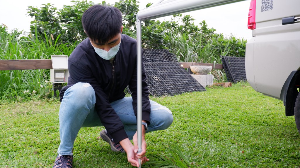 先是同心協力拉出車邊帳,至少有個避風遮雨的小天地;千萬要記得要釘營釘!一定要釘!營釘就在車子前座的收納箱打開就會看見了。