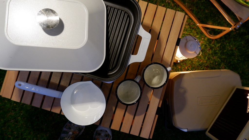 畫面中的每項物品都是《日日好露營車》附ˋ給我們的,其中包含冰桶、燒烤盤、卡式爐、小牛奶鍋、營燈、品牌法瑯杯;配色就是要讓你怎樣都可愛!