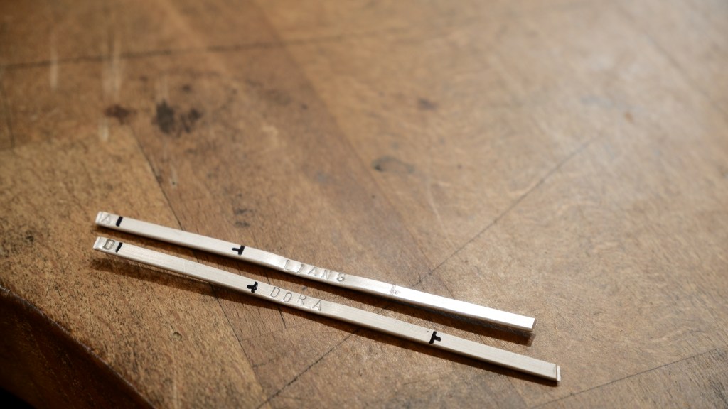 我跟亮是彼此幫對方做戒指,所以就在戒指印下自己的英文名,是不是超級浪漫!雖然在敲的時候,壓力會有點大,但不盡完美其實也是手作的樂趣阿,想到是對方用心敲的,心就暖暖的。(左邊標示線的字母也是為了讓我們在銀材質上也有至少一次練習的機會)