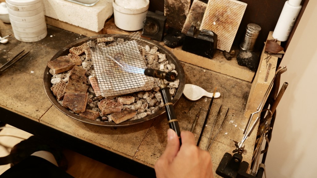 工作室提供的器具、材料都超級完善,我們只要專注於好好聽老師的話。首先是在接合處塗上幫助焊接的相關物質,接著再用火烤!