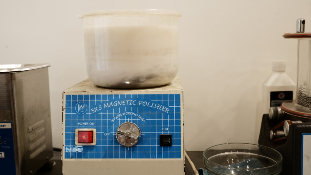 最後將戒指丟進兩種機器裡拋光,先用鋼針拋光較細微的部分,轉個20分鐘;再放進加了無患子(能讓銀飾品發亮的神奇秘密)用鋼珠拋光銀戒的機器20分鐘。