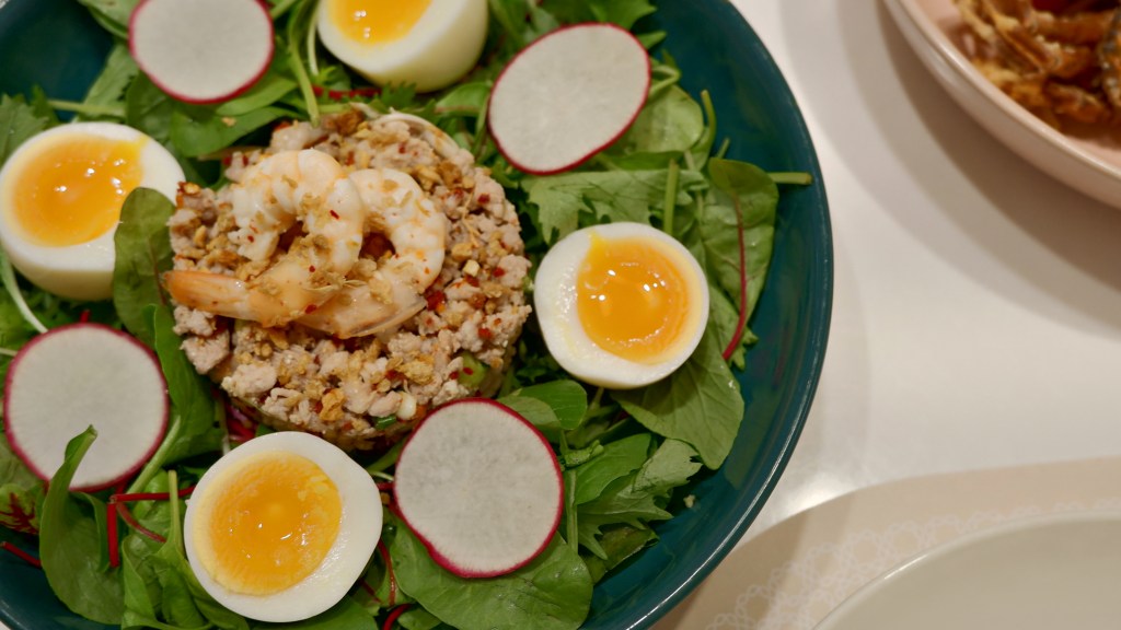 很划算欸!搭配活動加購只要$239就有一大盤的打拋豬溏心蛋,看似清爽的一道前菜,其實很夠味;強烈建議將嫩葉生菜、櫻桃蘿蔔、溏心蛋、蝦子跟打拋豬,全部混在一起吃,溏心蛋跟櫻桃蘿蔔會很神奇地中和菜味及打拋豬的辣(真的有辣喔!不過這道菜的辣度可以調整),別忘了沾些底部還有魚露跟檸檬製成的醬汁,酸辣酸辣有夠讚。