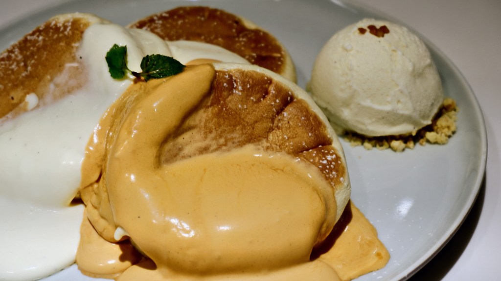 綿密柔軟的舒芙蕾入口即化,每一口都千萬要沾滿濃郁香甜的泰式奶茶醬或是美味卡士達,還附有一球冰淇淋,以及底下的餅乾碎片,通通一口放進嘴裡,Oh my god吃在嘴裡真的是滿出來的幸福感!而且一份就有三大塊舒芙蕾,兩個人share也很夠吃,超級滿足。