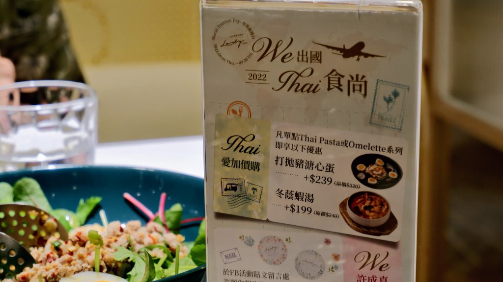 精打細算的小資族我本人絕對是會認真看桌上的優惠活動,現在只要點泰式義大利麵Thai Pasta或是歐姆蛋 Omelette系列,就可以+$239加購一份打拋豬溏心蛋/+$199加購一碗冬蔭蝦湯,加啊絕對要加起來、通通吃吃看!