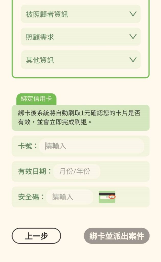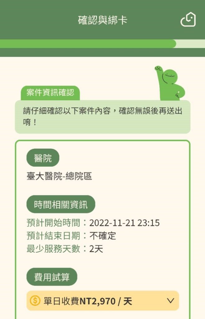 綁定信用卡以後即可送出案件,系統就會針對你的需求與將近2000位具有合法執照的臺籍照服員進行媒合,接下來就是耐心地靜靜等待。