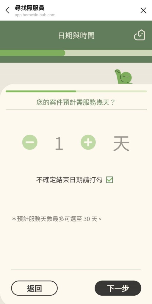 接下來就是要填入會需要服務多久;這邊我想說,介面的設計完全可以感受到《Home心》的用心!填入開始的時間後,會詢問服務的天數,不過當時連醫師都不是很確定需要休養多久,還好系統有一個「不確定結束日期請打勾」的選項,把所有可能都考慮進去,有夠貼心。