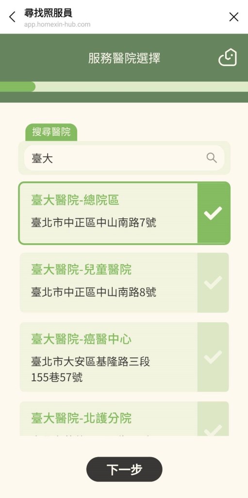首先要先填入必要資訊,幫助系統精準找到你所需要的看護;第一題就是需要服務的醫院,全台灣的醫院皆可透過《Home心》進行配對,不過目前已服務過的醫院還是以北部居多(可能北部的接受度比較高)