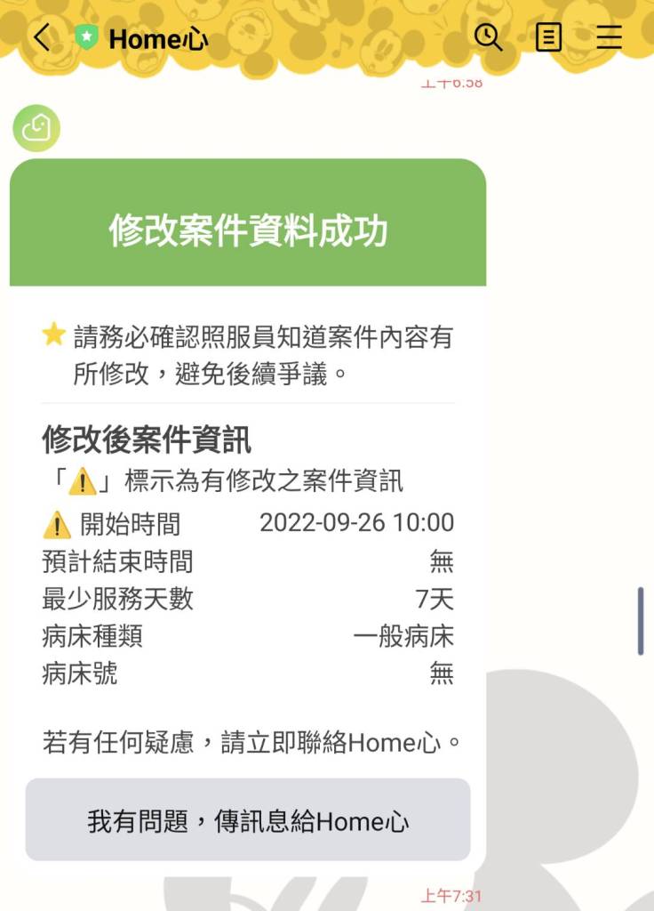 一配對成功,照服員馬上就打電話我瞭解病患的狀況,以及病房位置等。這邊分享一個小插曲,原本醫生估計會在ICU待三天但臨時更改為一週,由圖可以看到我原本預訂9/22請照服員上工,也在電話聯繫的過程中讓對方知道情況,她真的是來救贖我的天使!願意等到患者轉到一般病房再上工,雙方溝通順利就可以直接「修改案件」。