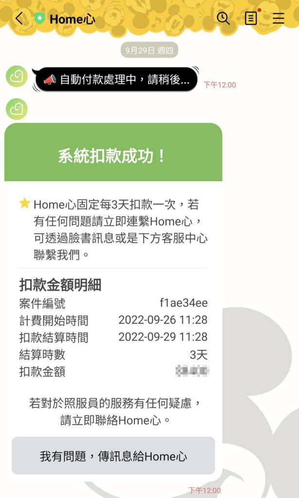 我真心大愛這個功能,超級推!完全不用跟看護有面對面金錢上的往來,我覺得彼此都能減少「要錢、給錢」的尷尬與壓力,而且系統很固定就是滿3天直接用綁定的信用卡扣款乙次,非常方便,也不用怕自己忘記付款。