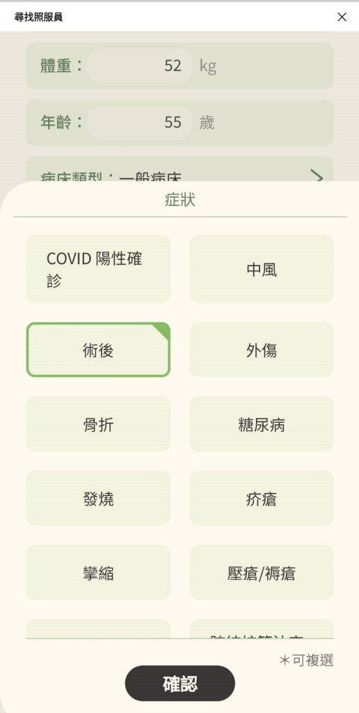 接著,就要依據病人的狀況填寫正確的資料,這些問題都是別出心裁,我個人認為越精準的資料,肯定能為你媒合到更符合需求的照服員。