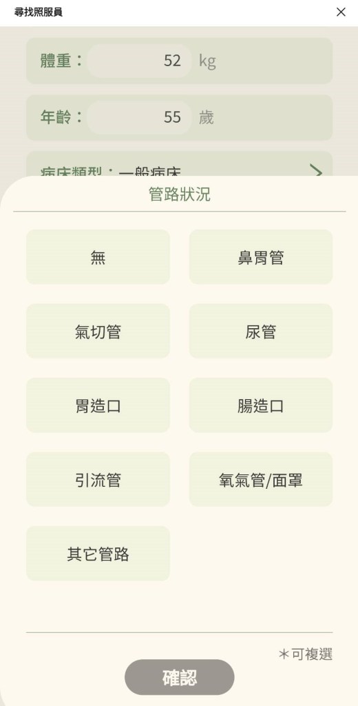 管路狀況:這絕對要填寫正確!一來讓照服員更了解病患狀況,二來這些管路會牽涉看護是否有相關照顧的技能與經驗;比如說氣切管就不是每個看護願意照顧的。