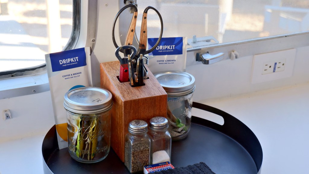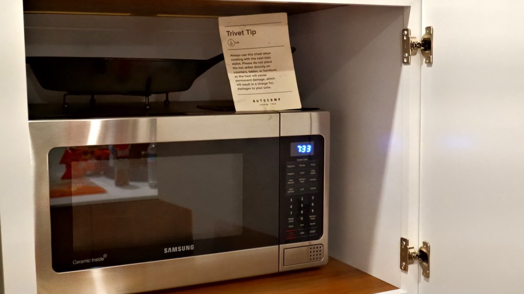 AutoCamp也準備了各種野炊及做菜需要的基本調味料及工具,甚至是喝酒需要用的的開瓶器都幫你準備好,另外也附有咖啡以及茶包可以享用;那如果真的真的真的不會野炊(但真的強烈建議要體驗自己煮!後面有超簡易野炊分享),露營車內甚至備有微波爐,在美國這個微波食品大國,有微波爐就絕對不會餓死啦。