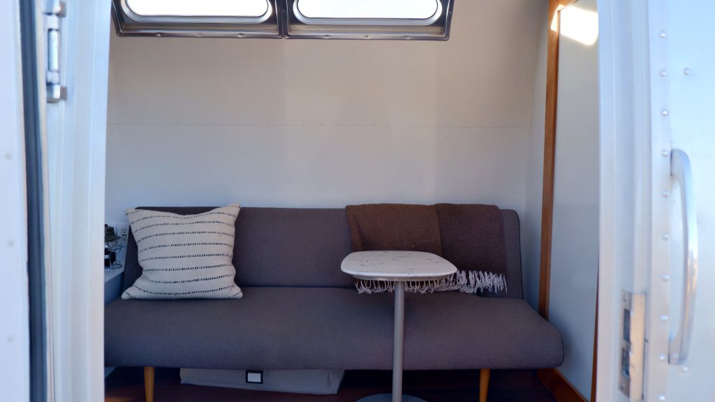 一打開露營車映入眼簾的是小巧可愛的沙發區,晚上無聊可以坐在這邊滑手機、看書、吃吃點心,另外還備有溫暖的毯子(沙漠日夜溫差很大)賴在這裡當沙發馬鈴薯都很舒適;你們看那個陽光打進來,真的是好漂亮呀!