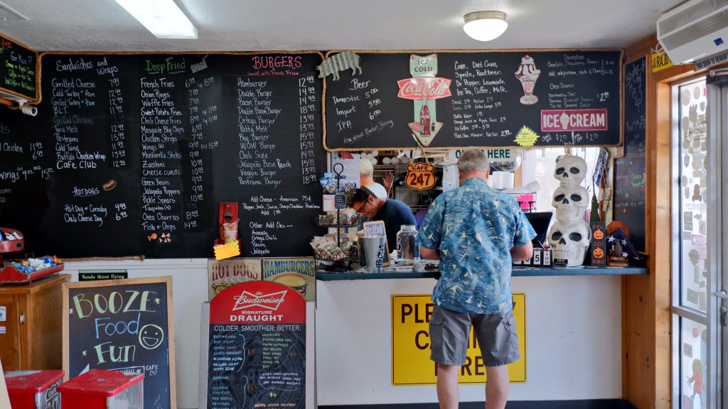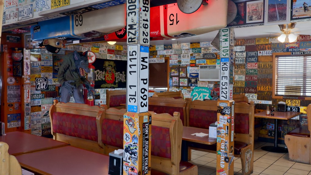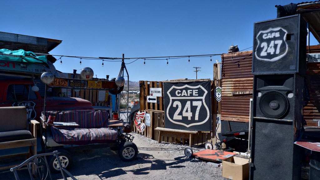 由西向東開往約書亞樹國家公園的路上,會經過無數一望無際啥也沒有的道路;而Cafe 247就開在一個nowhere,自己號稱是鎮上最好吃的漢堡(也不確定有沒有別的漢堡店?)當時開車開到餓昏的我們,來到這間超酷的店。