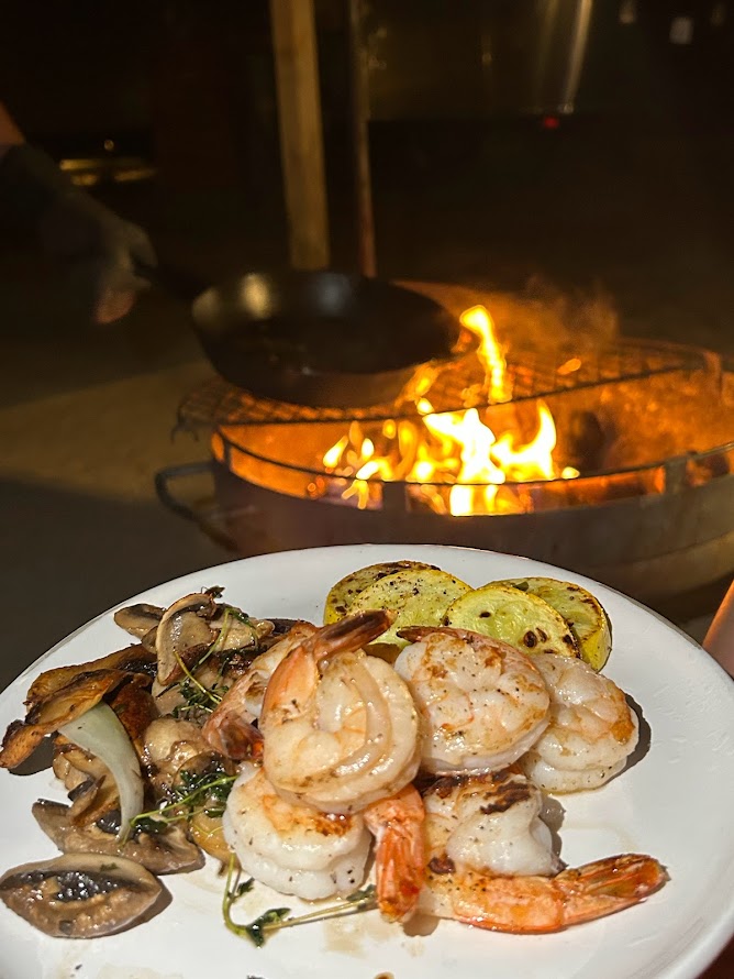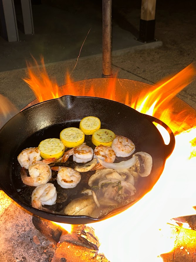 當你的火生起來的那一刻,這個夜晚你就成功了。把油噴上鑄鐵鍋等個幾秒鐘,把想吃的放上鑄鐵鍋,等它熟了加點調味粉,每個都好吃的不得了!
