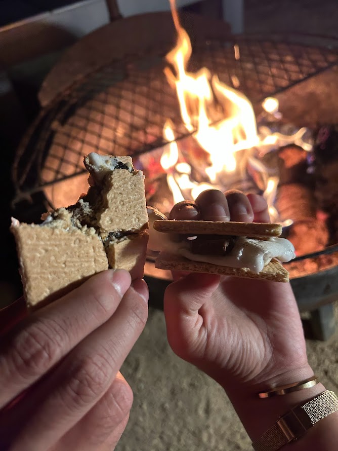 最後就是如我所說,用美國人露營的經典甜點S’MORE,為美好的夜晚畫上完美的句點!插棉花糖的長竹籤可以直接跟櫃檯要,然後考棉花糖的時候很容易燒焦,但感覺變成焦糖(?)也是蠻好吃的哈哈,最後用全麥餅乾夾住巧克力跟熱騰騰的棉花糖,等巧克力融化全部黏在一起,再一口咬下去,就會甜進心坎裡!(怎麼分享到後來變成美食錦集XD)